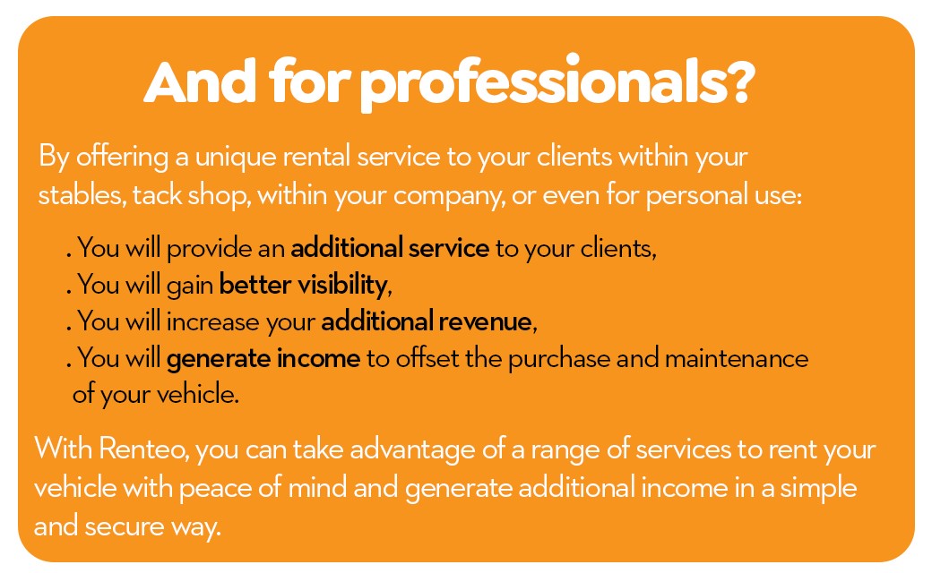 To attract attention to your vehicle, Renteo offers a complimentary communication kit that empowers you to market your vehicle in your local area. Additionally, we leverage the influence of social media and Google to actively promote the vehicles featured on our platform. You'll also benefit from increased visibility during the events and competitions that Renteo participates in...